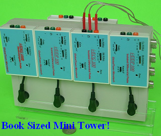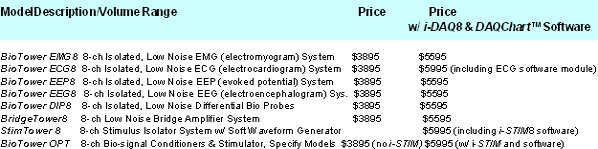 i-STIM, i-BRIDGE, i-TEMP, i-EMG, i-ECG, i-EOG, i-ERG, i-EEP, and i-EEG. Each of which can be used as a stand alone unit for close probing/monitoring of one parameter, when necessary (please see separate news below). The users can also choose up to 8 of the same modules, so far, on the mini tower platform for specific applications, e.g. StimTower-8 (an 8-CH stimulator), BridgeTower-8 (an 8-CH bridge amp), or BioTower™ ECG8 (an 8-CH i-ECG system for 12-lead ECG recording).